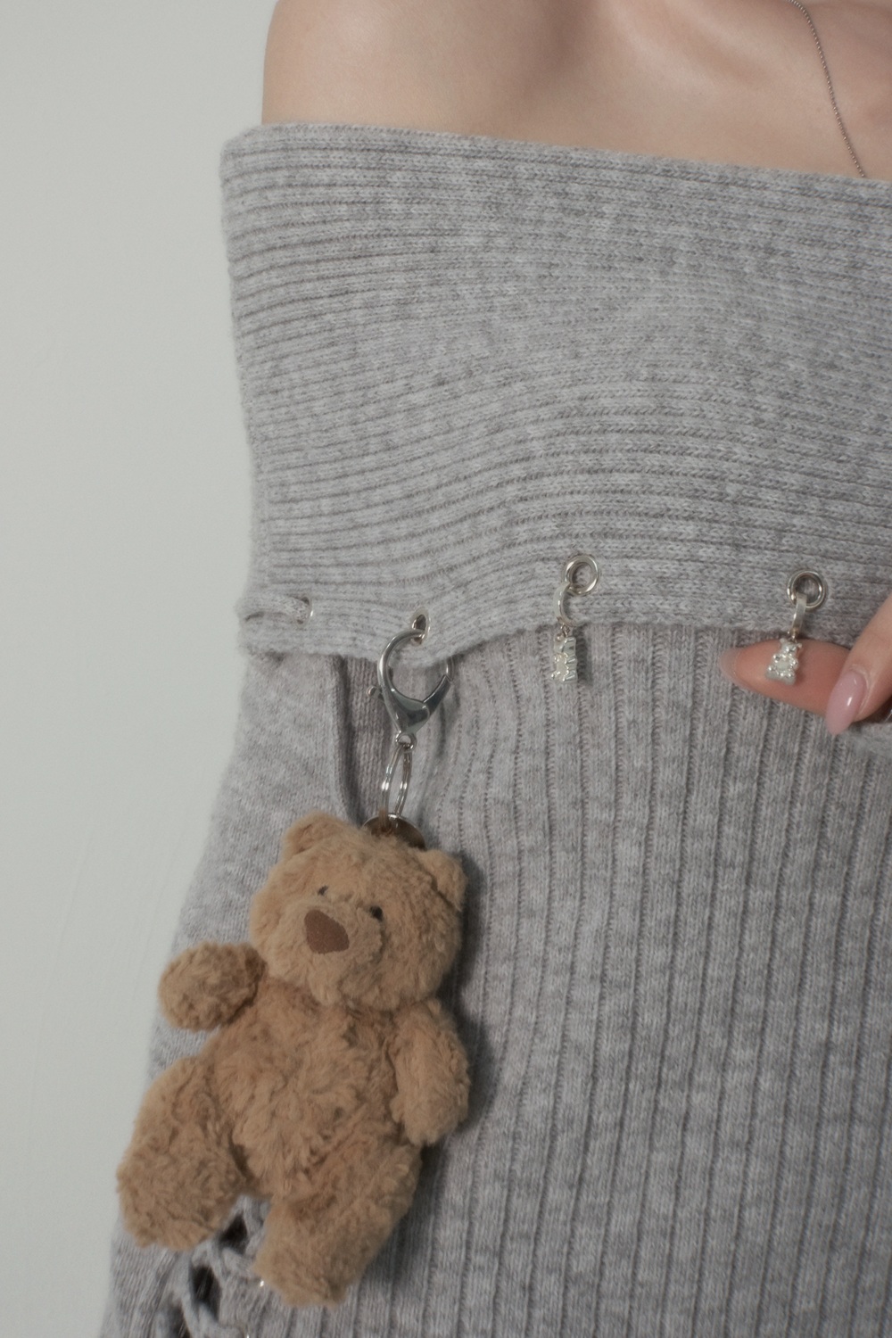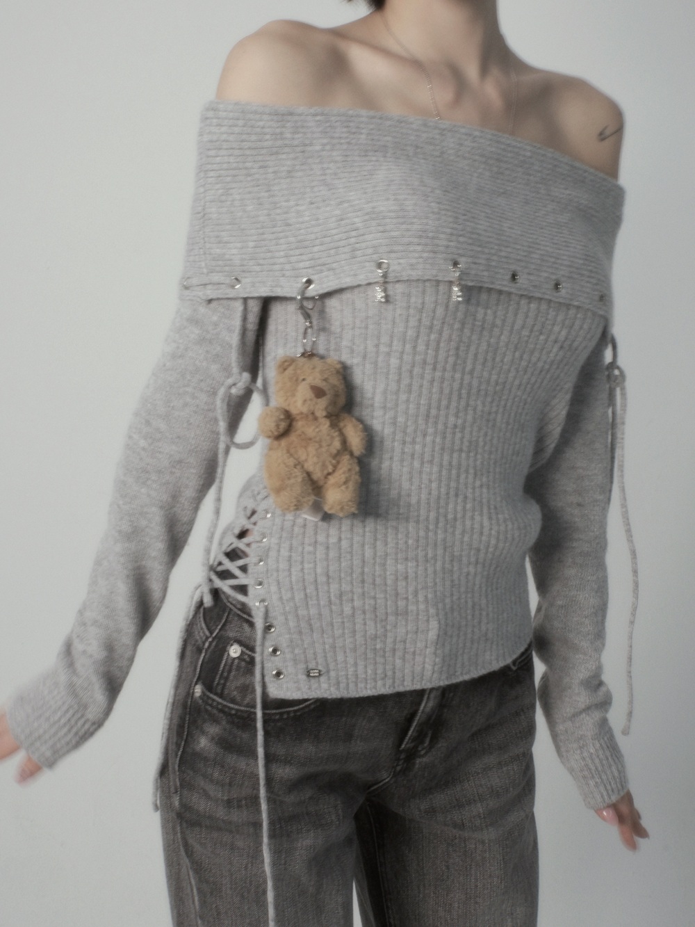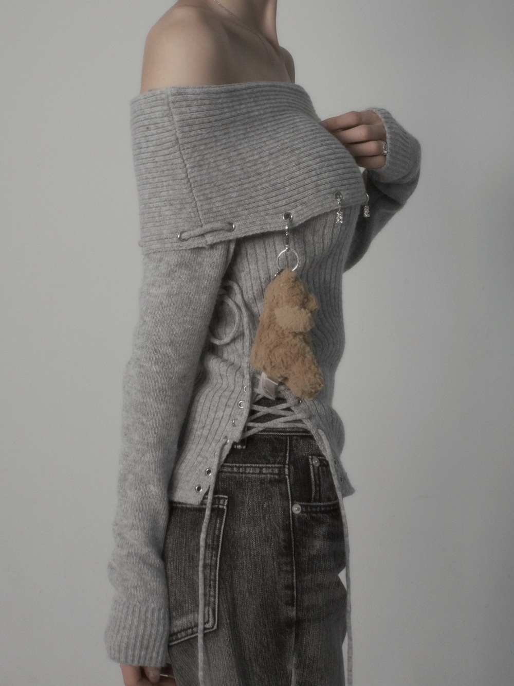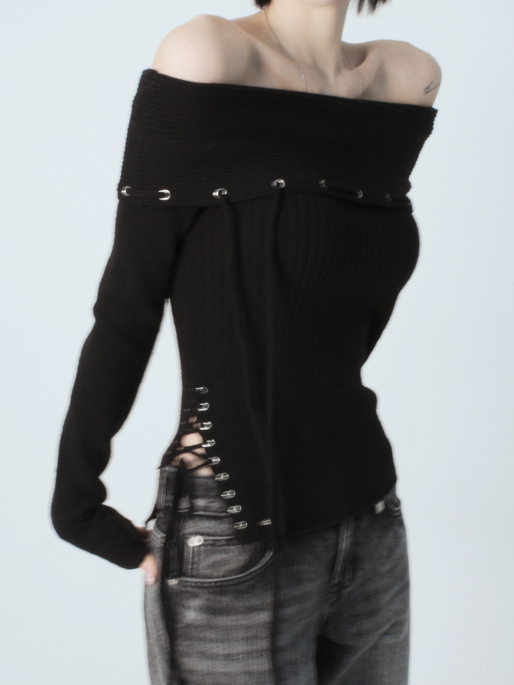 Eyelet String Off-Shoulder Knit T